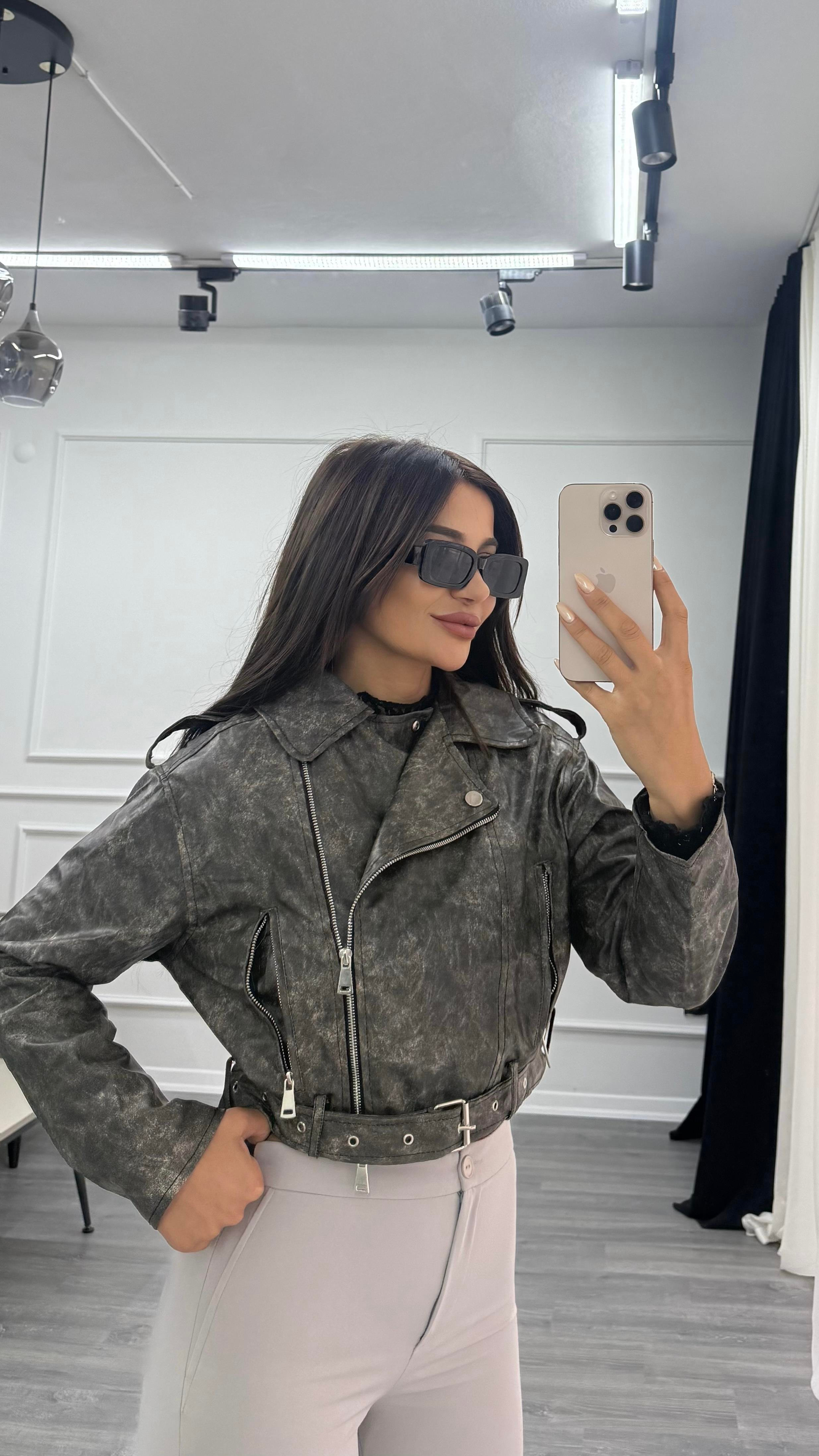 Antrasit Kemerli Astarlı Eskitme Deri Biker Kısa Ceket (DVS4030)
