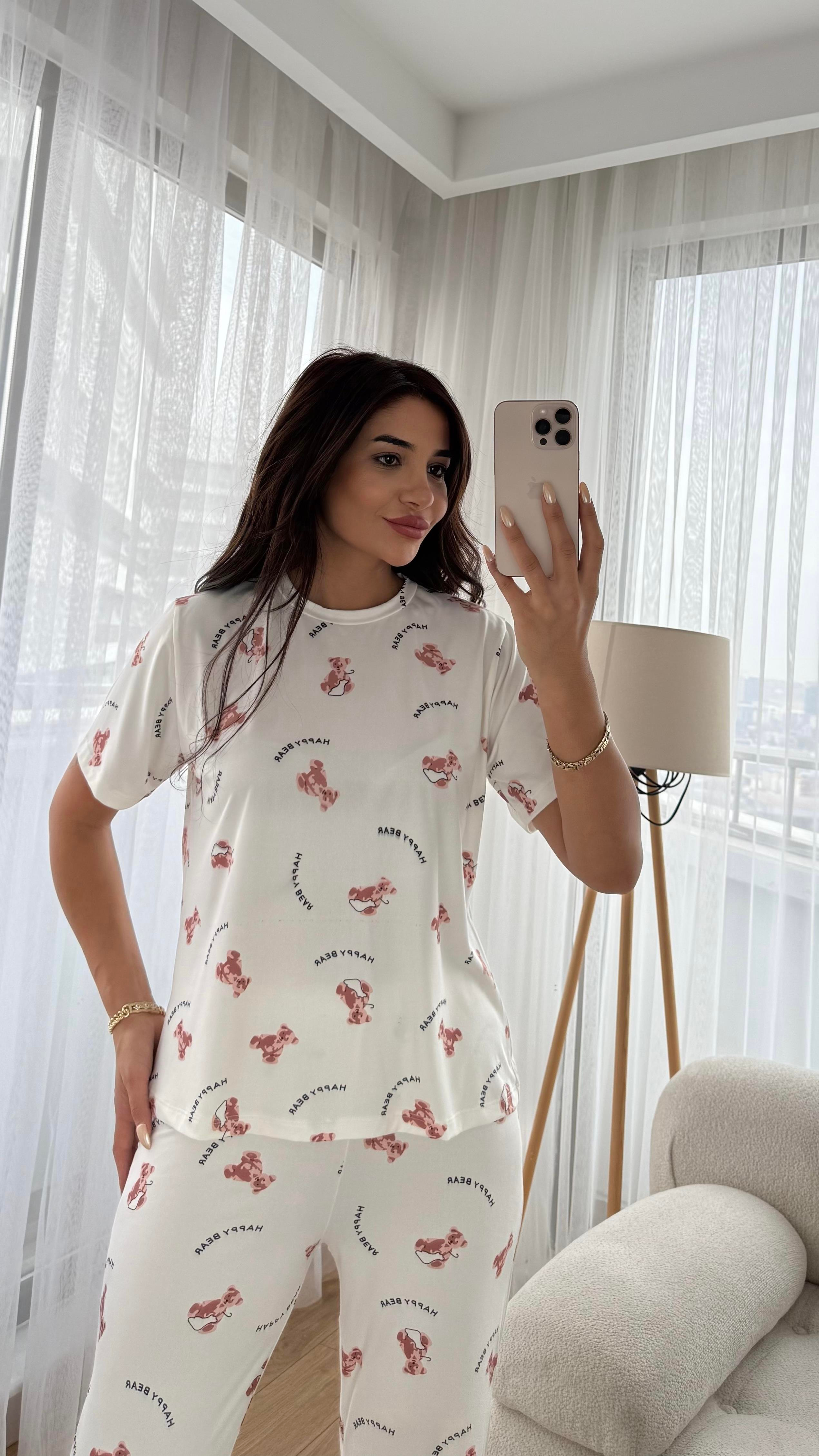 Beyaz Premium Kalite Kısa Kollu Ayıcık Desenli Pijama Takımı