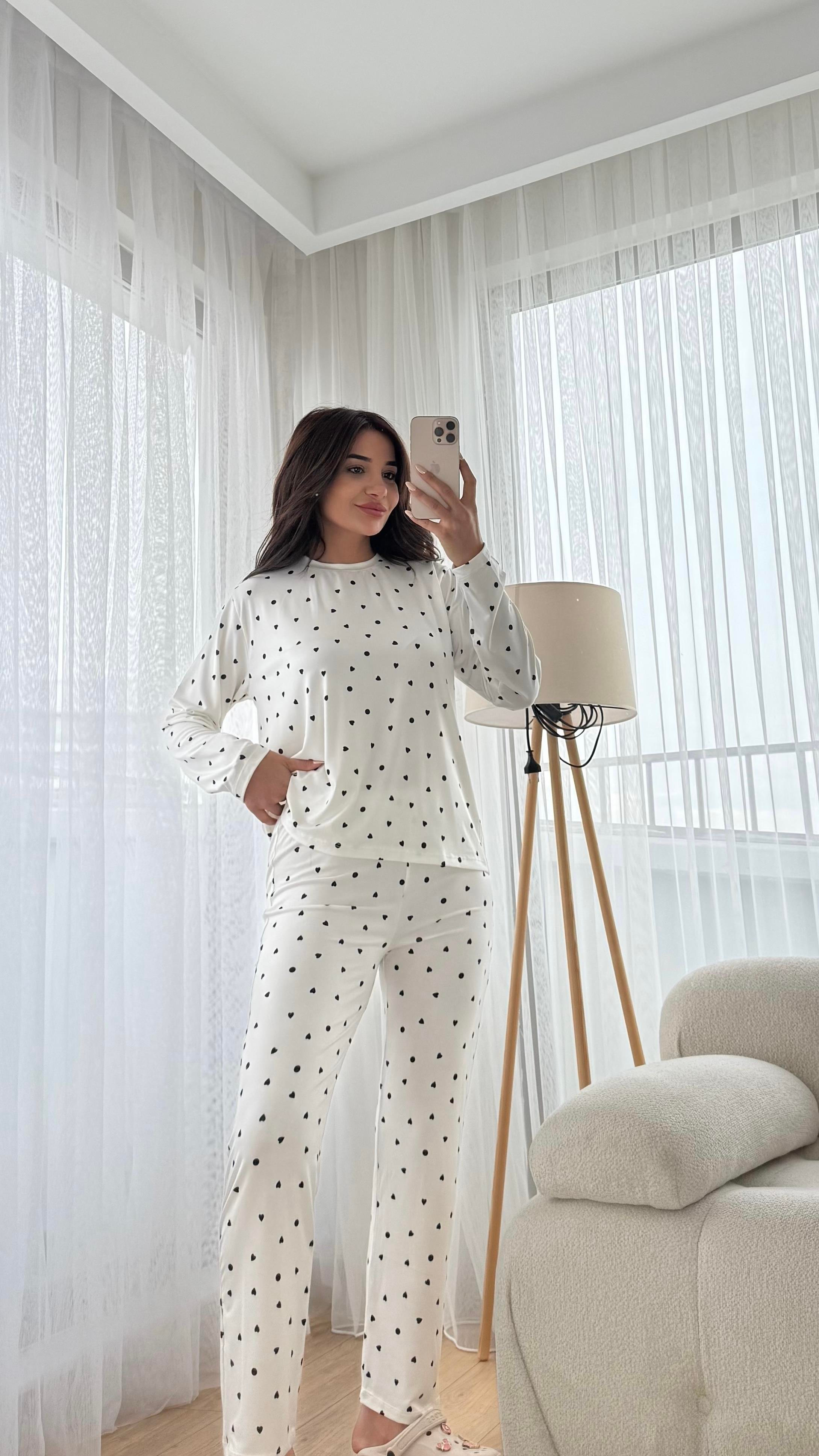 Beyaz Premium Kalite Uzun Kollu Siyah Kalp Desenli Pijama Takımı