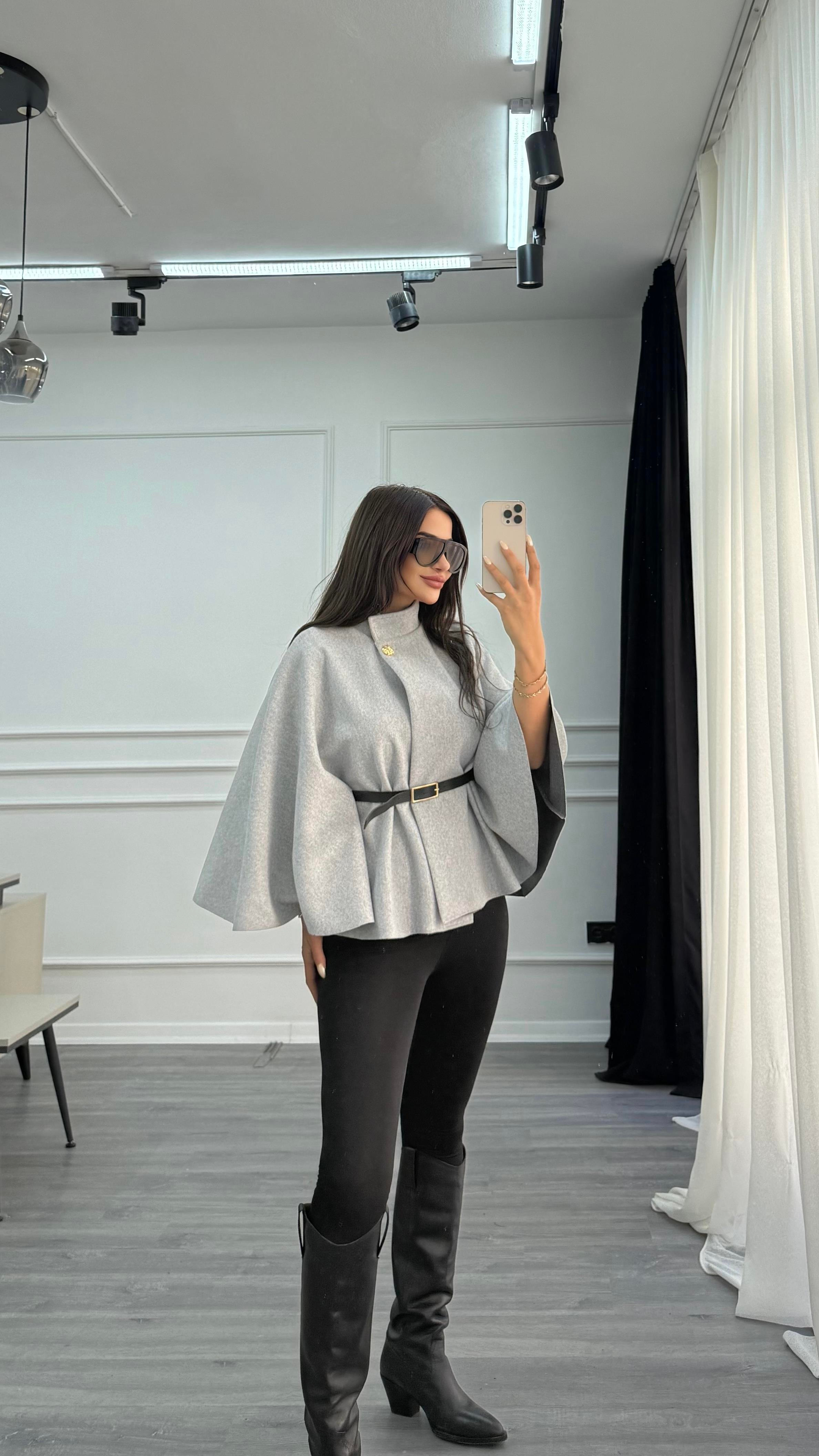 Gold Düğmeli Kaşe Kemerli Panço-Gri