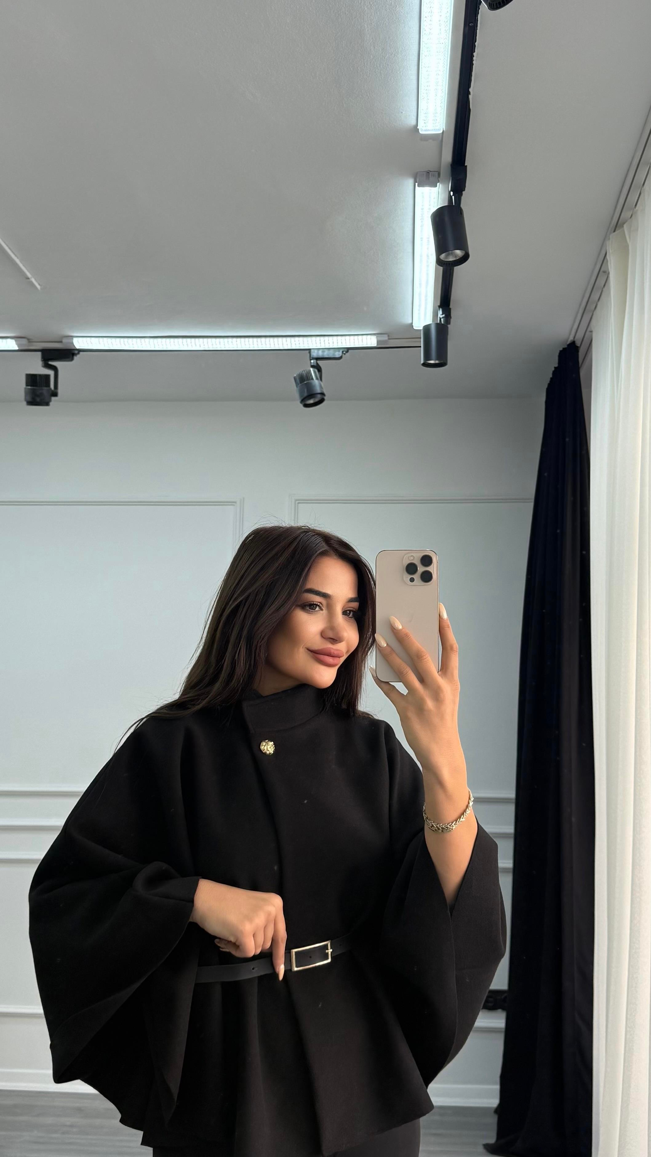 Gold Düğmeli Kaşe Kemerli Panço-Siyah (DVS5599)