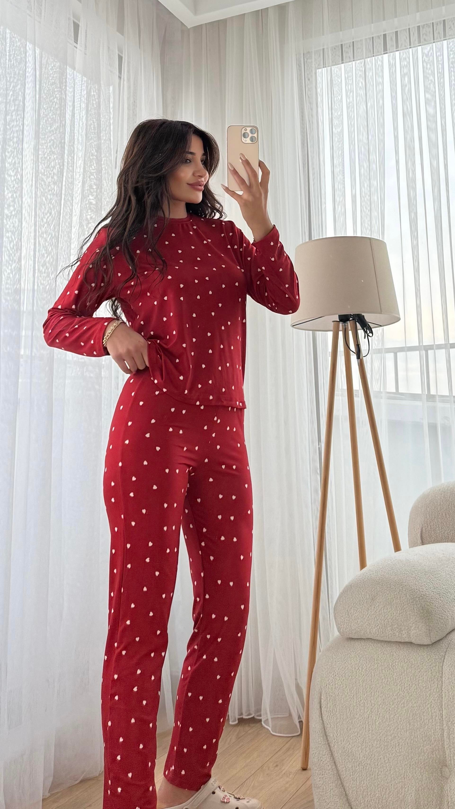 Kırmızı Premium Kalite Uzun Kollu Beyaz Kalp Desenli Pijama Takımı