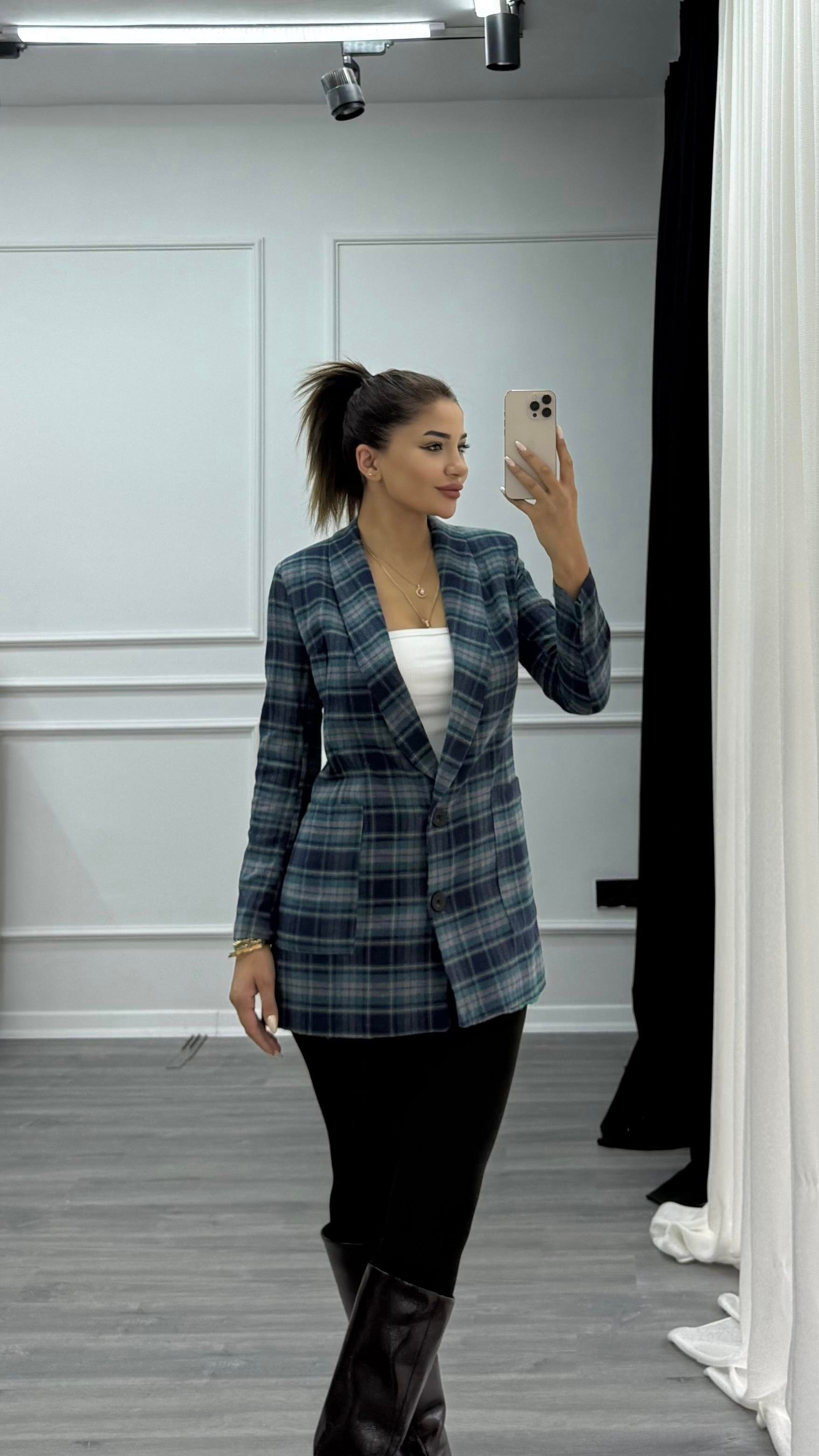 Lacivert Uzun Cepli Ekose Desenli Çift Düğmeli Astarlı Ceket (DVS4010)