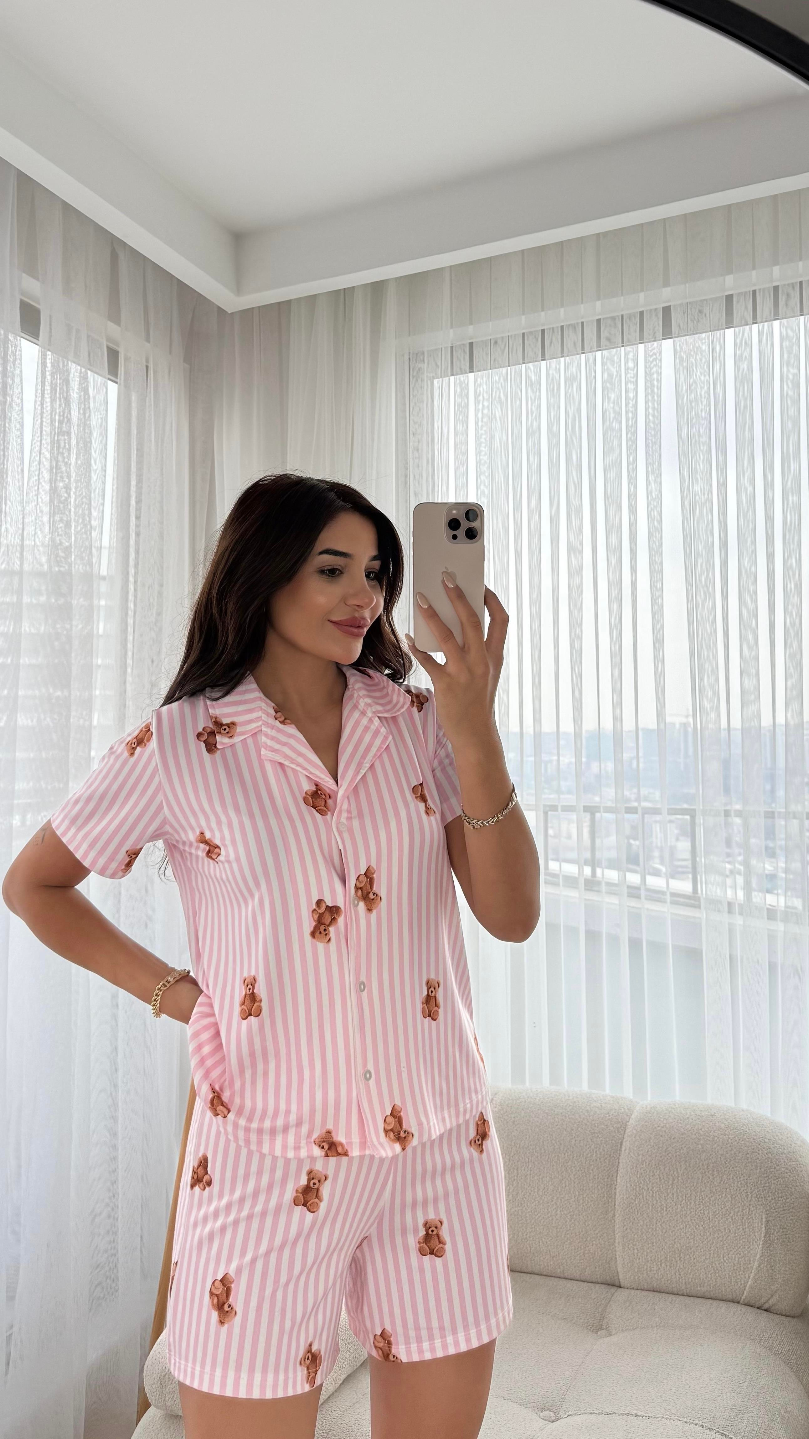 Pembe Premium Kalite Gömlek Şortlu Ayıcık Desenli Pijama Takımı