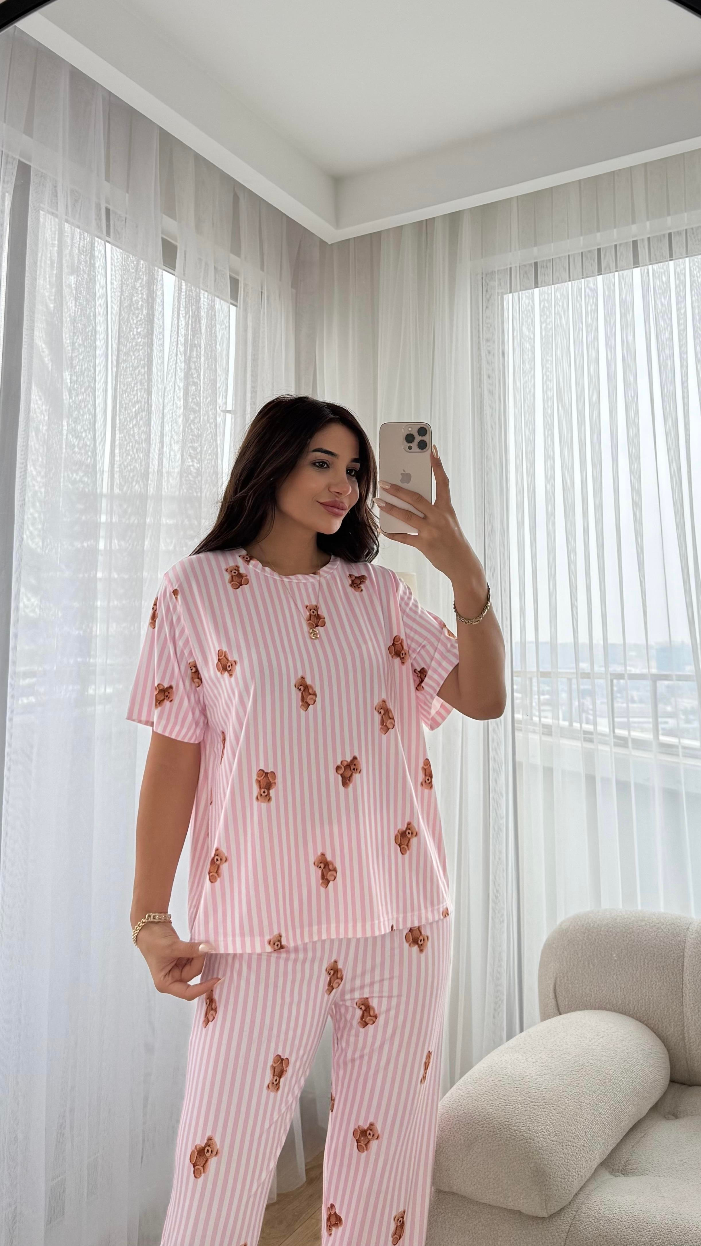 Pembe Premium Kalite Kısa Kollu Ayıcık Desenli Pijama Takımı
