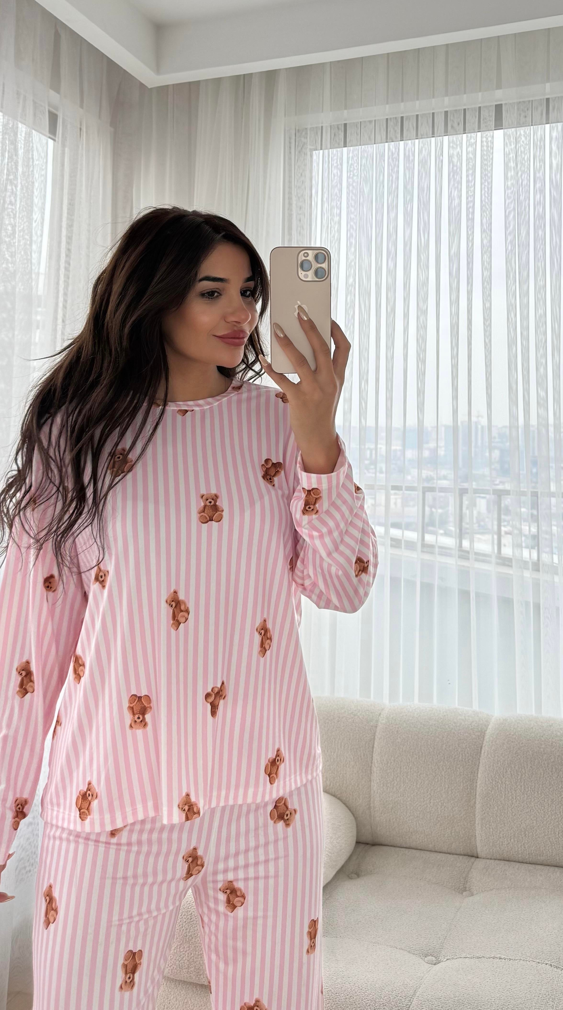 Pembe Premium Kalite Uzun Kollu Ayıcık Desenli Pijama Takımı