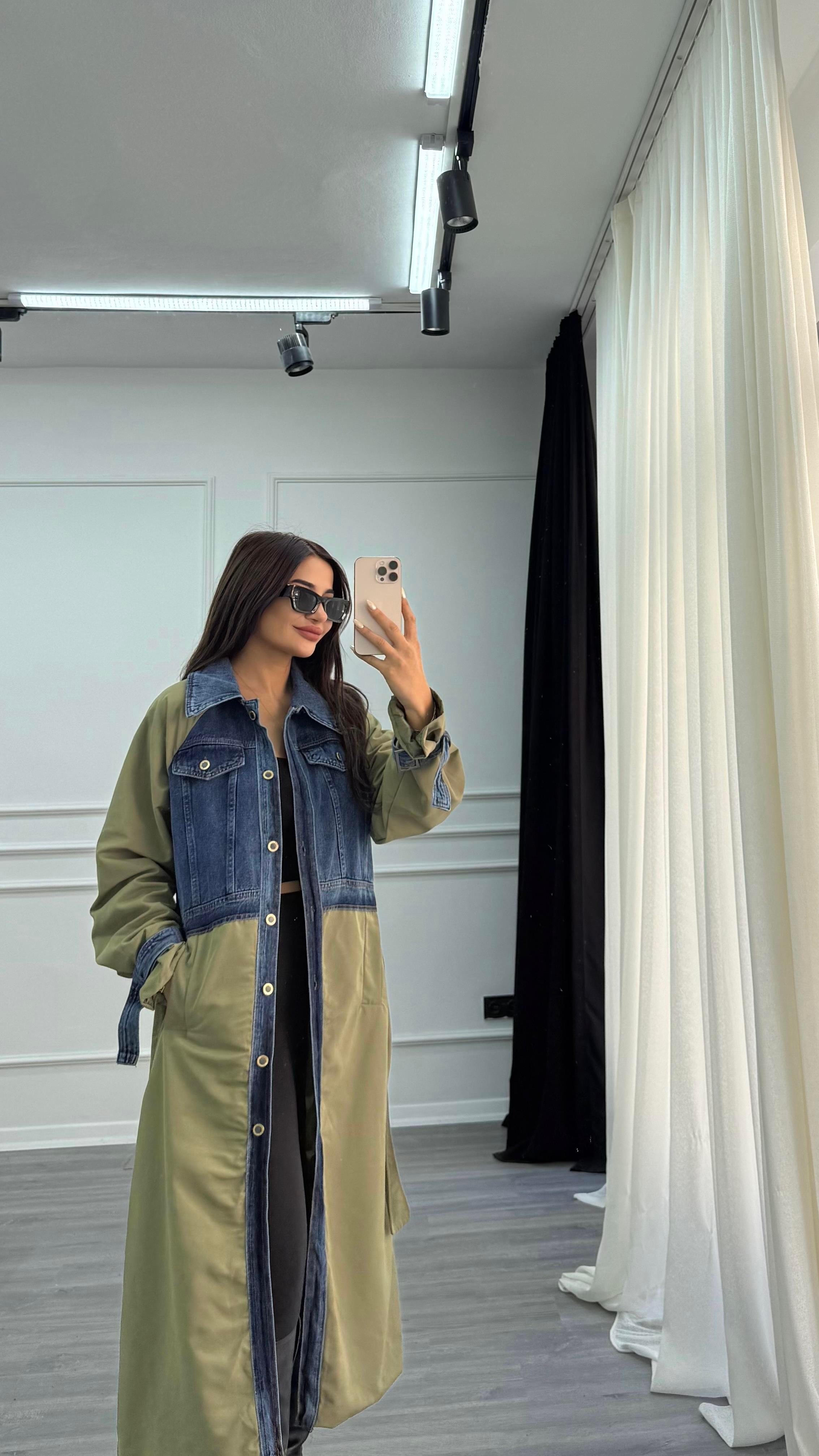 Yeşil Uzun Denim Detaylı Kuşaklı Trençkot